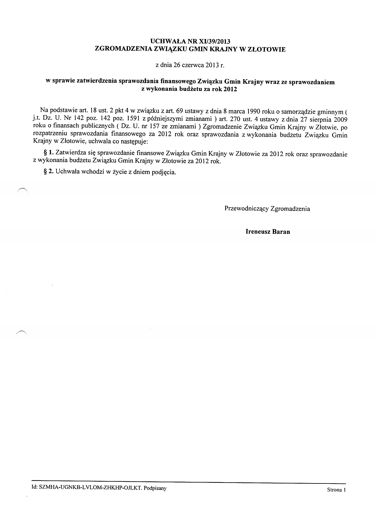 UCHWAŁA NR XI/39/2013 ZGROMADZENIA ZWIĄZKU GMIN KRAJNY W ZŁOTOWIE z dnia 26 czerwca 2013 r. w sprawie zatwierdzenia sprawozdania finansowego Związku gmin Krajny wraz ze sprawozdaniem z wykonania budżetu za rok 2012 r.