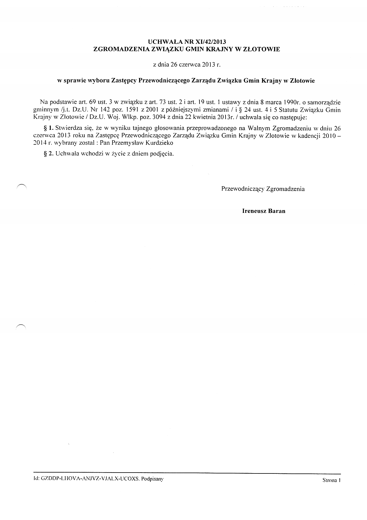 UCHWAŁA NR XI/42/2013 ZGROMADZENIA ZWIĄZKU GMIN KRAJNY W ZŁOTOWIE z dnia 26 czerwca 2013 r. w sprawie wyboru Zastępcy Przewodniczącego Zarządu Związku Gmin Krajny w Złotowie