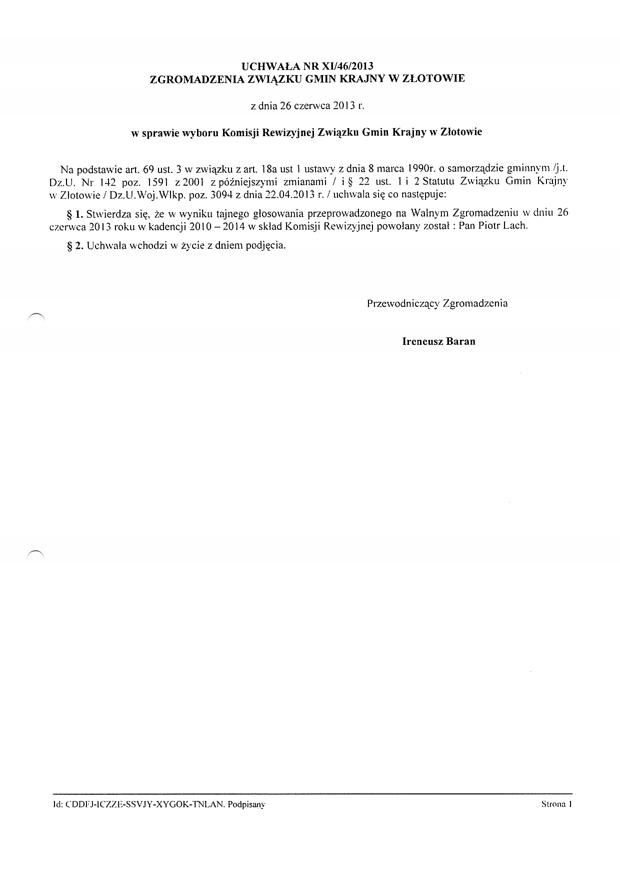 UCHWAŁA NR XI/46/2013 ZGROMADZENIA ZWIĄZKU GMIN KRAJNY W ZŁOTOWIE z dnia 26 czerwca 2013 r. w sprawie wyboru Komisji Rewizyjnej Związku Gmin Krajny w Złotowie